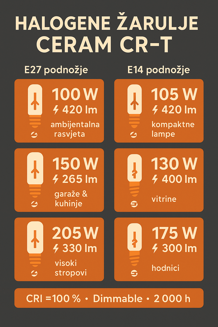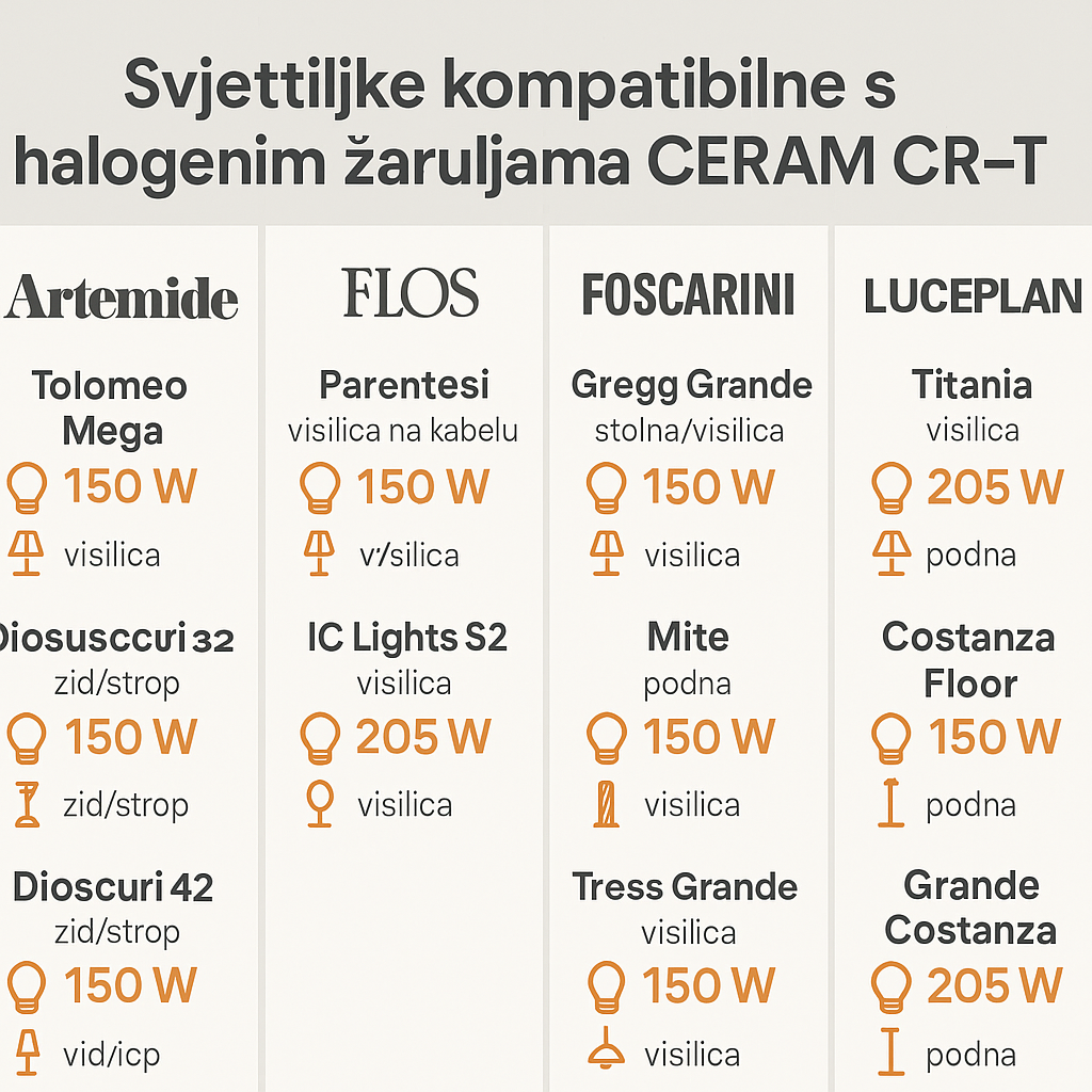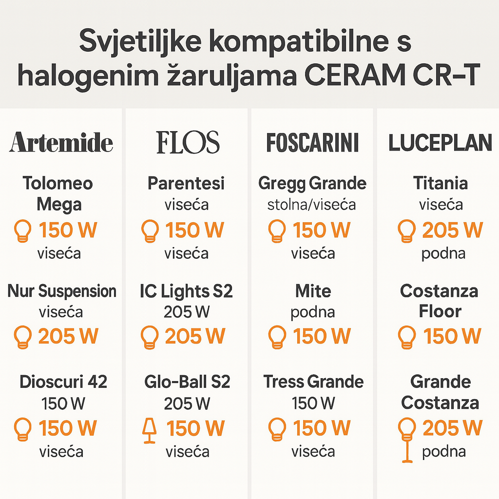 Kod svih navedenih modela proizvođač u tehničkoj dokumentaciji dopušta klasične halogene snage 100–205 W s navojem E27 (ili američkim E26) – upravo onakav format u kojem se isporučuju CERAM CR-T žarulje. U praksi samo pazite da ne prekoračite maksimalnu snagu zadanu u tablici.