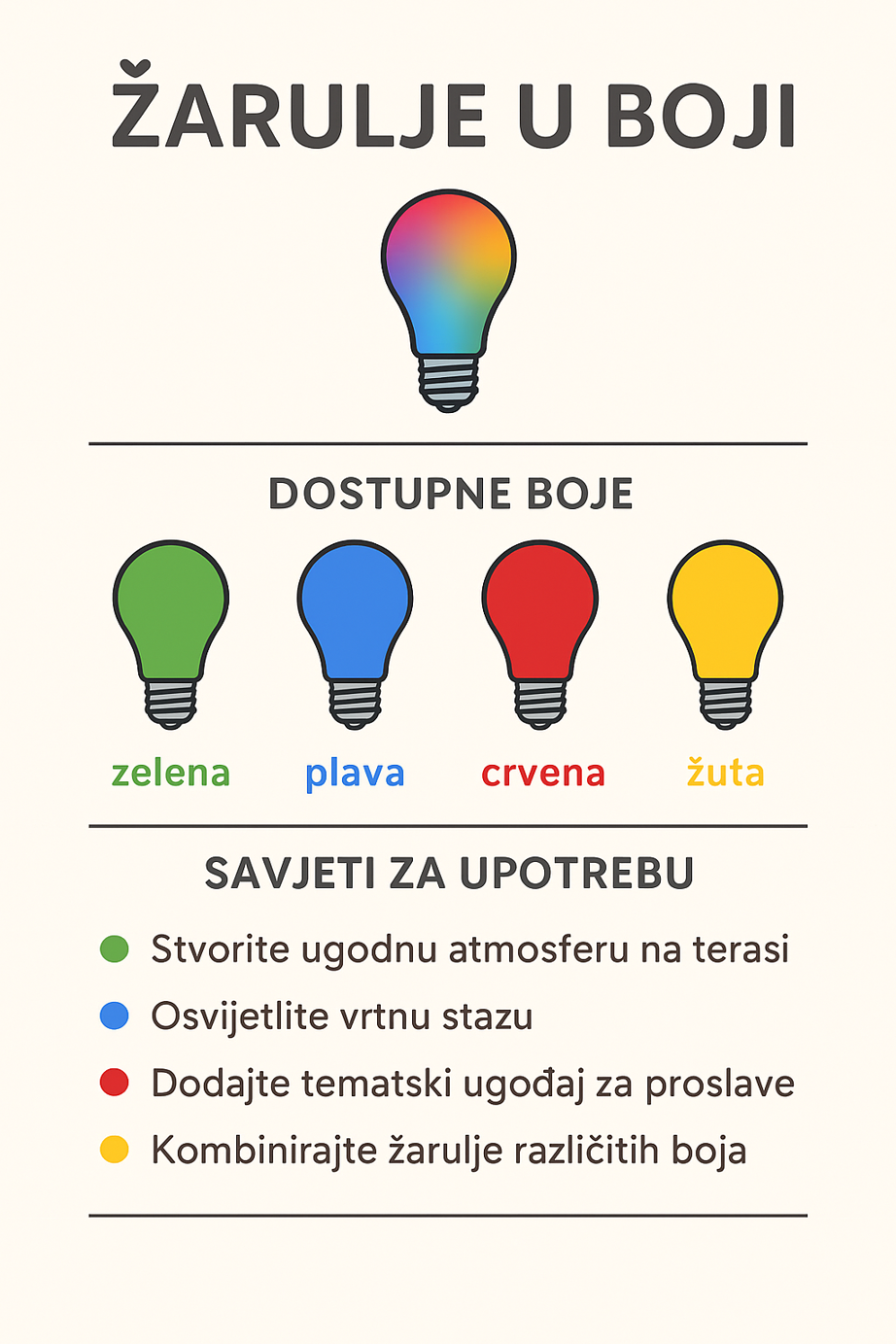 - LED žarulje u boji – energetski učinkovite, dugotrajne i dostupne u nizu boja (crvena, plava, zelena, žuta,…).