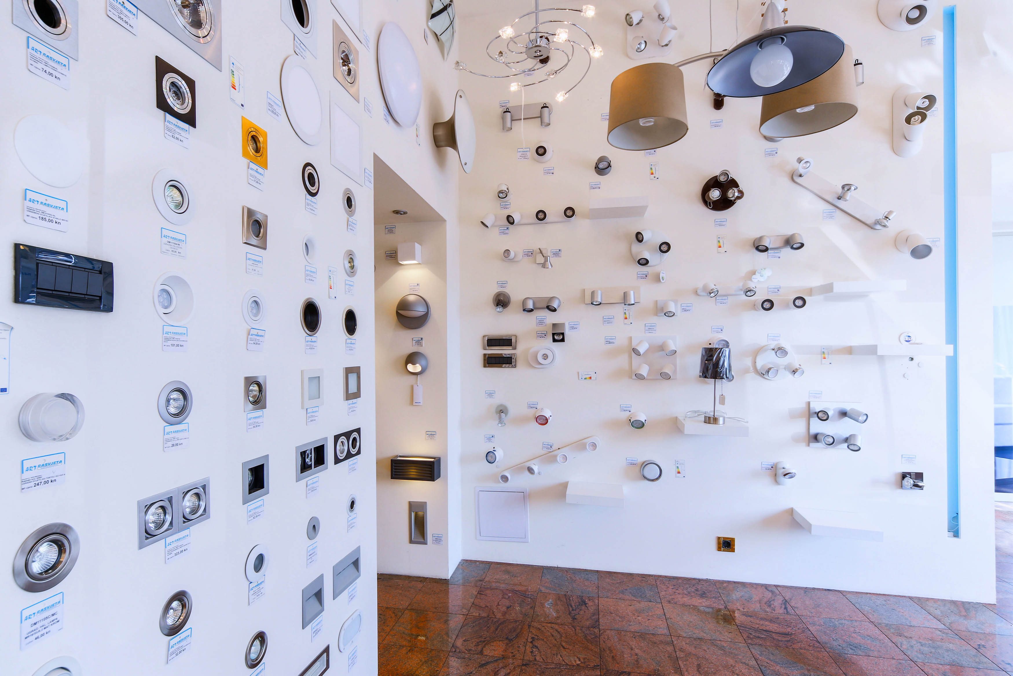U salonima Art-rasvjete možete pronaći rasvjetu za vanjsko (eksterijeri) i unutarnje (interijeri) uređenje privatnih i poslovnih prostora. U našoj ponudi možete pronaći sve tipove rasvjetnih tijela. Od lustera, visilica, plafonjera, reflektora i halogenih lampi do različitih modela stajaćih, stolnih, zidnih, podnih, dječjih svjetiljaka i LED rasvjete.